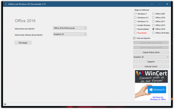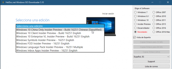 El «descargador de ISO de Windows y Office», te da acceso a las imágenes oficiales alojadas en los servidores de Microsoft, de todas las versiones disponibles de Windows 7, Windows 8.1, Windows 10, Office 2007, Office 2010, Office 2011, Office 2013, Office 2016, y varias versiones especiales de Windows, como las de Insider o la versión de Windows 10 para China.