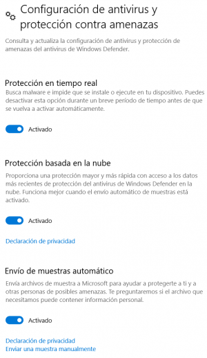 En Configuración del Antivirus accedes a las opciones de personalización, en donde puedes activar o desactivar la protección en tiempo real. Hay dos opciones que mejoran la detección de virus pero afectan a la privacidad, porque exigen enviar los nombres de fichero a la nube de Microsoft para detectar nuevos virus. Son Protección basada en la nube y Envío de muestras automático. Si te mueves en un entorno seguro, no es necesario.